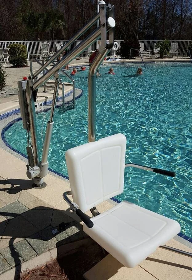 The Motion Trek Lift is an ADA compliant battery powered lift that is self-operable from the deck and water with a robust operating system. The Motion Trek product line offers a slightly slower rotation, to provide a more controlled, and comfortable movement from the deck to water. The housing over the rotation components near the base of the lift has been designed to shield the internal components from corrosion. A new armrest system on the Motion Trek stays attached to the lift and swings (pivots) out of the way below the seat to allow the user to transfer to the lift unimpeded and comfortably.